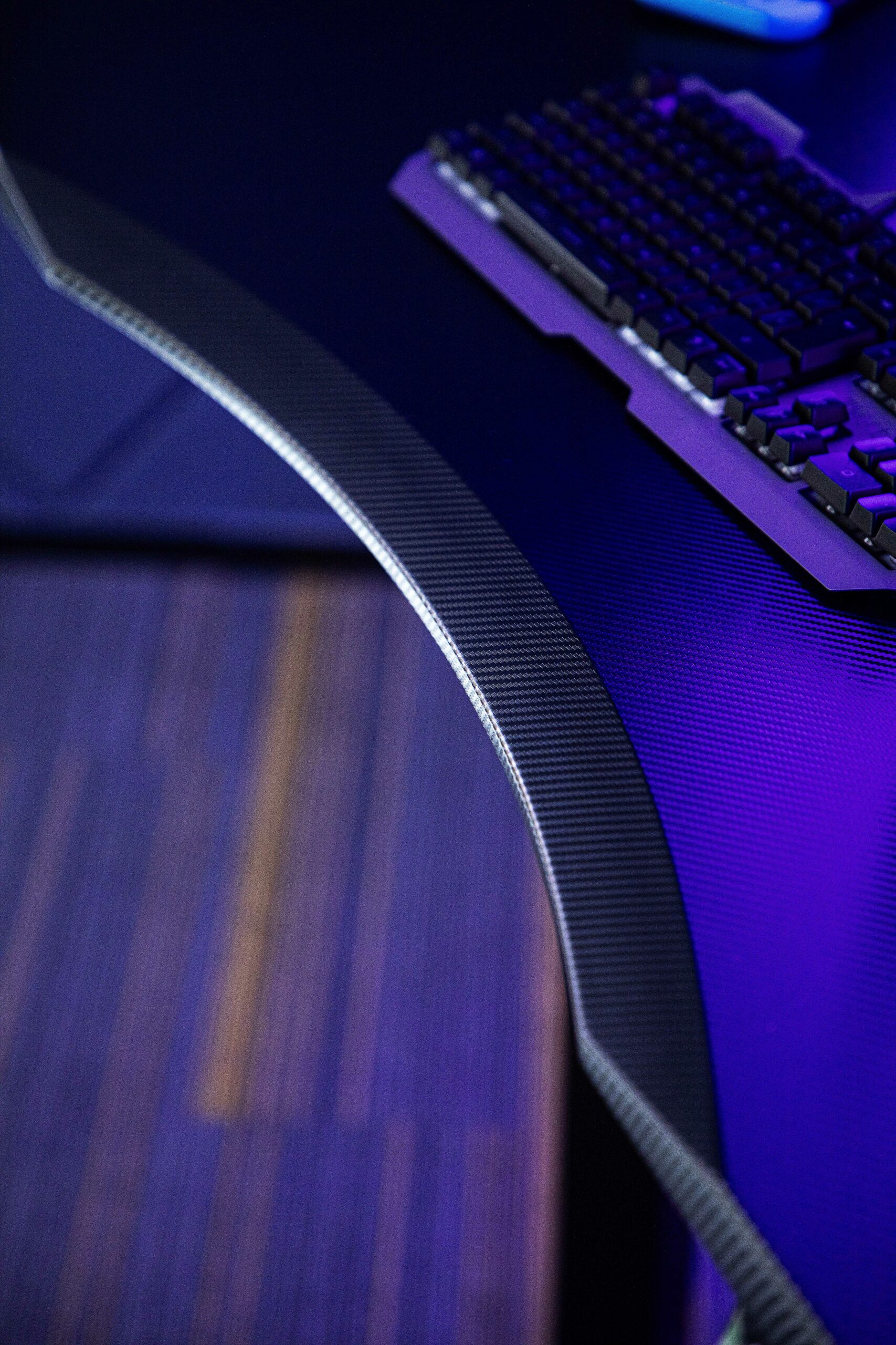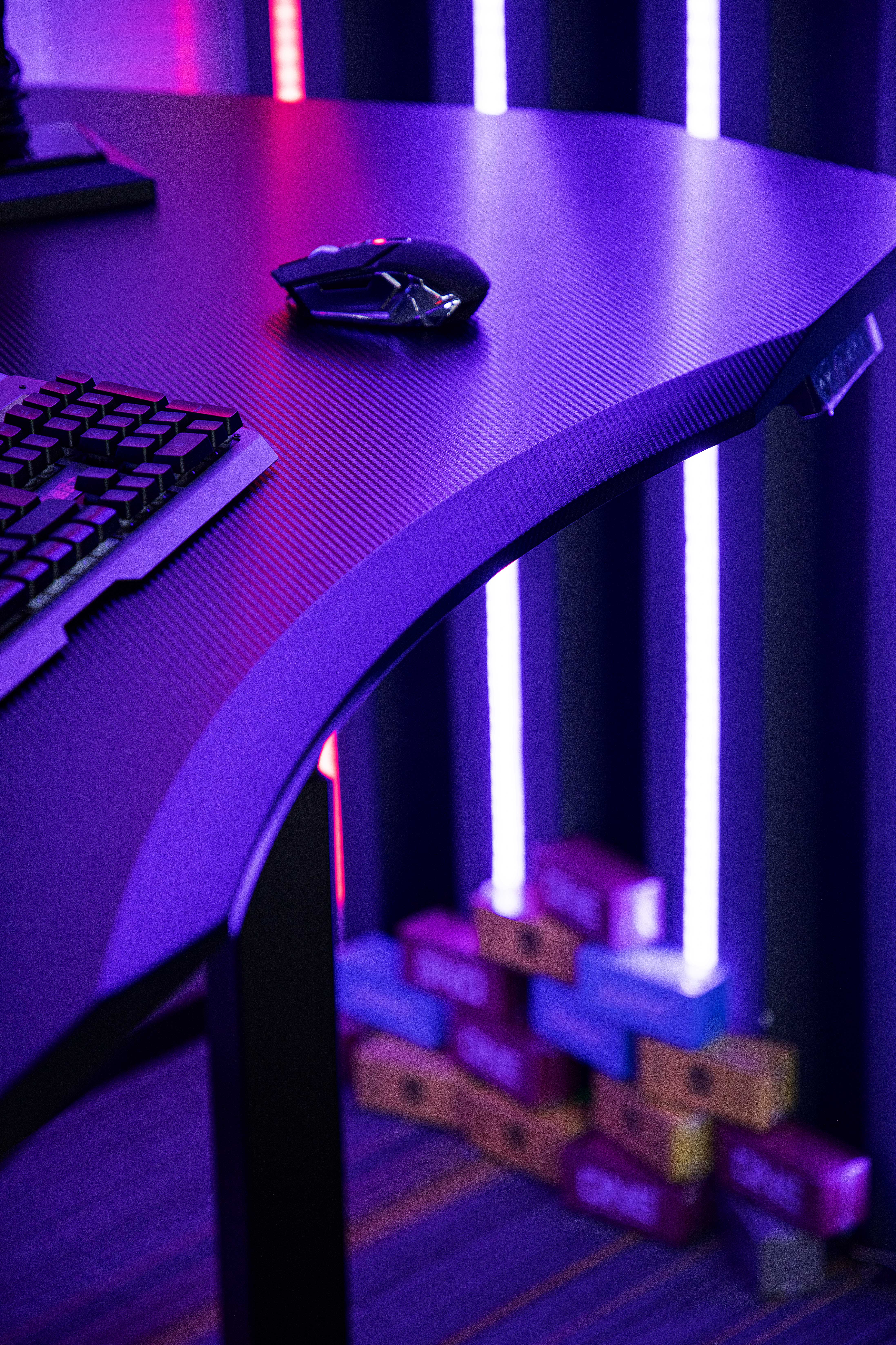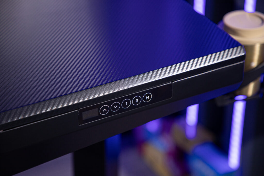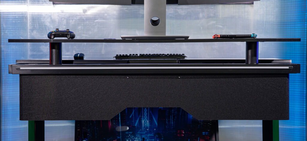 1.Dark 3D carbon fiber textured desktop: Non-slip, wear-resistant surface with low reflection, effectively reducing visual distractions during gameplay. The deep tone complements the RGB lighting system, adding depth and a professional esports atmosphere.
