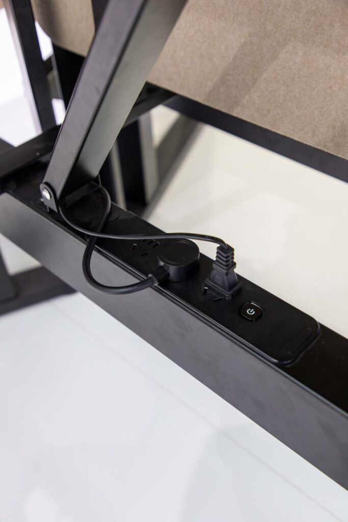 结合多功能电动置物模块,实现收纳与桌面系统的一体化设计。